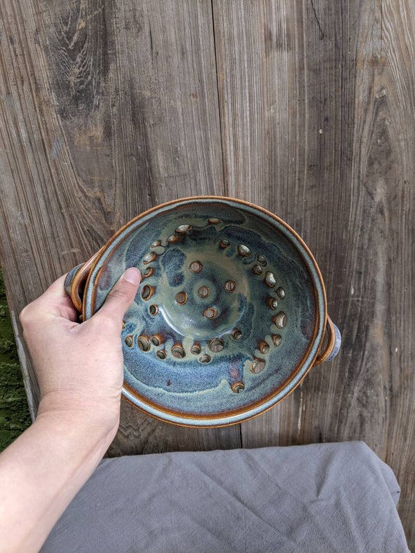 This berry bowl is great for rinsing and serving fruit. The holes are in a unique constellation like pattern, the glaze pattern and color varries slightly becuase of the nature of the glaze. Like all my pieces it is food safe, microwave and dishwasher safe. It holds about one quart of fruit.