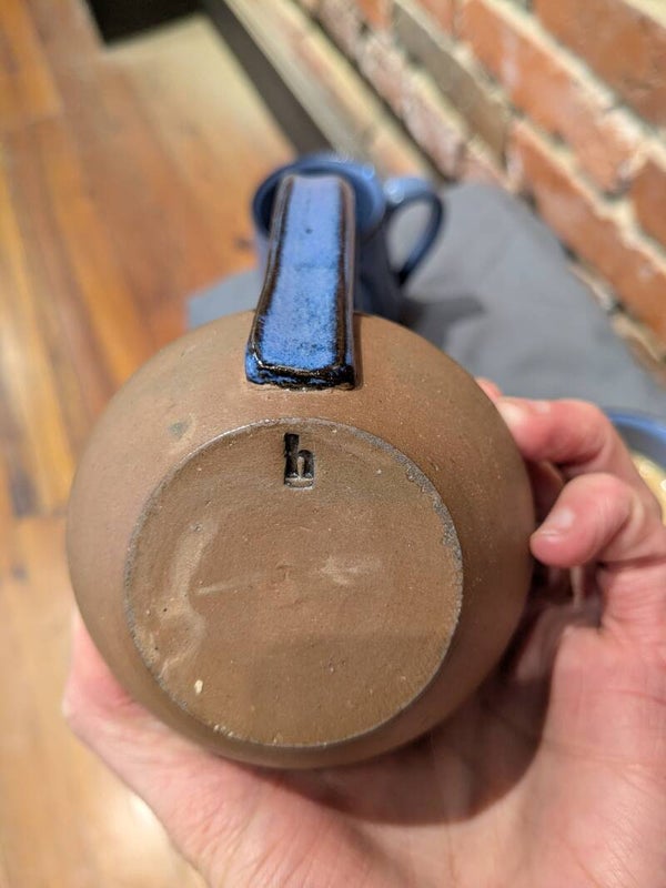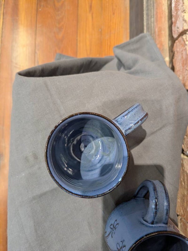 This unique blue mug fits comfortably in your hand. Great for a hot cup of coffee, tea or hot chocolate. It is glazed with a light flowing blue glaze and a carved flower design. This mug was handmade by me on my wheel in my studio in Camden, NJ.